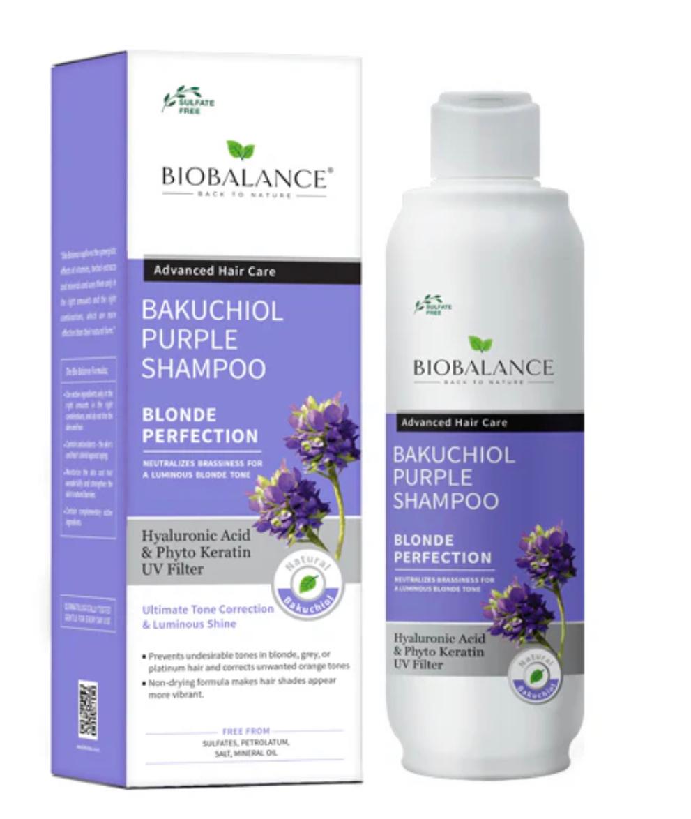 شامبو باكوشيول البنفسجي من بيو بالانس هو منتج متخصص في العناية بالشعر الأشقر، الرمادي، الأبيض، أو المصبوغ، حيث يعمل على تصحيح الدرجات النحاسية أو البرتقالية غير المرغوب فيها، مما يُحسن من إشراقة اللون ويُحافظ على صحته.